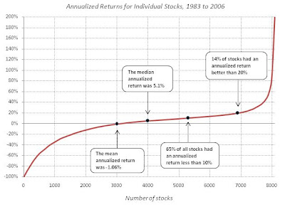 When most people think of the stock market they do so in terms of index results. Popular indexes include the S&P 500 and the Russell 3000. However, most people are not aware of the tremendous differences between winning and losing stocks “beneath the hood” of a diversified index. From 1983 to 2006 over 8,000 stocks (due to turnover and delisting) were at some point members of the Russell 3000. The Russell 3000 Index measures the performance of the largest 3000 U.S. companies representing approximately 98% of the investable U.S. equity market. (Some Russell 3000 statistics here.)