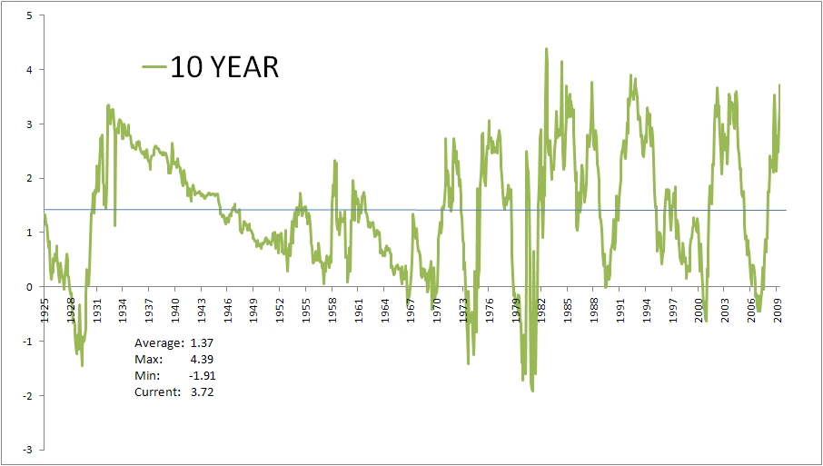 There is a lot of talk lately about trading the yield curve, steepeners, flatteners etc (and here and here). Forest from the trees, I would much rather be on the flattening side than the opposite. It seems like a simple mean reverting series.