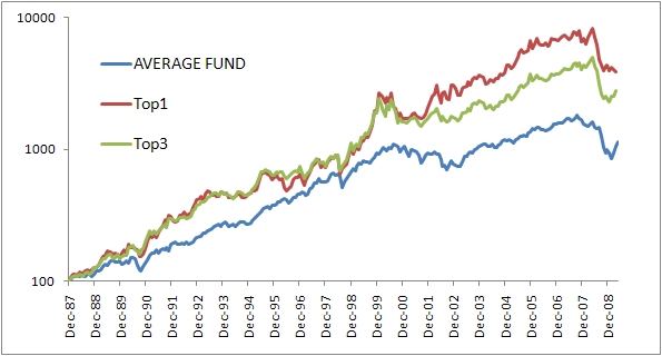 Simply taking the top fund, updated monthly, based on the average rolling 3/6/12 month performance resulted in compound returns of 18% per year, vs. 10% for the average fund.