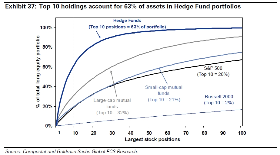 And probably my favorite graphic, here is the portfolio density of hedge funds vs. mutual funds. If you recall from the academic literature, you want the concentrated funds and not index huggers.