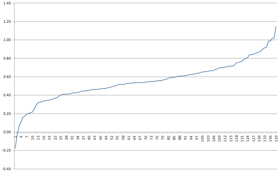 Below is the cumulativeve distribution of the Sharpe ratios for the 140 CTA’s with the longest track records. Look familiar??? Remember, this is with all the funds that disappeared because they blew up.