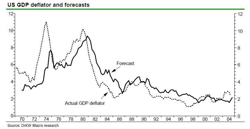 The first chart shows economists attempts to forecast the rate of inflation as measured by the GDP deflator. Sadly it reveals a pattern that will become all too common in the next few charts. Economists are really very good at telling you what has just happened! They constantly seem to lag reality. Inflation forecasts appear to be largely a function of past inflation rates.