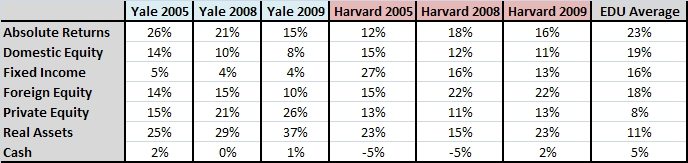Harvard & Yale Asset Allocations March 18, 2010 FacebookTwitterWhatsAppLinkedinEmailPrint 2009 is Yale’s target allocation rather than actual allocation.