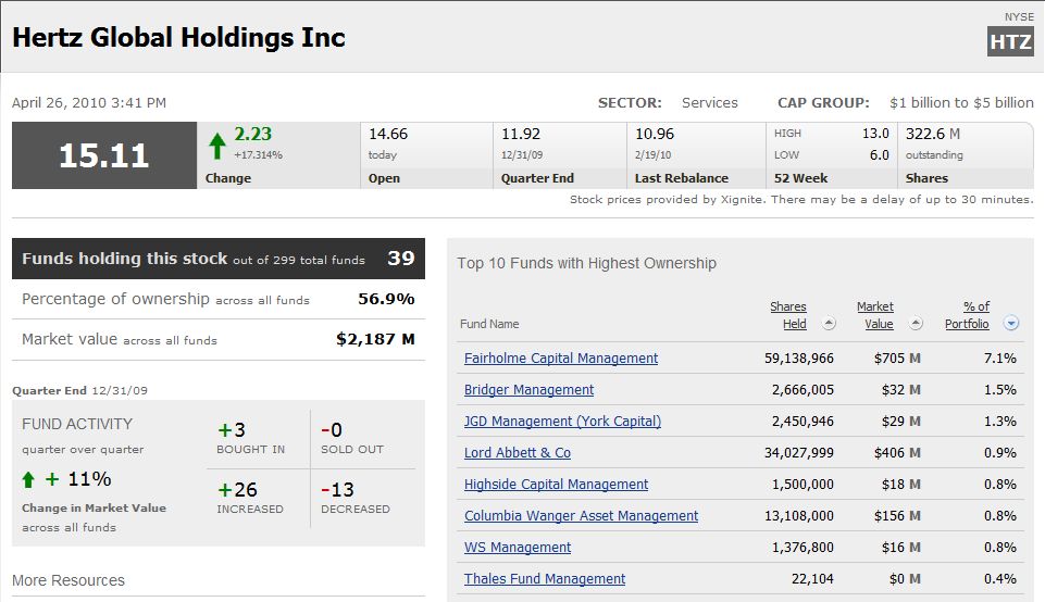 What fund has the most exposure to an in-the-news stock like Hertz (HTZ) today? Answer: Berkowitz’s Fairholme at 7%?