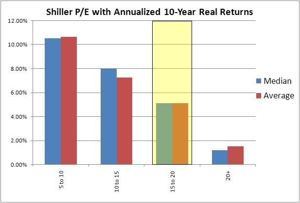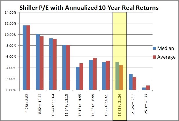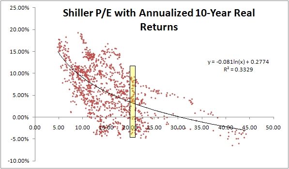 I was playing around with the data over on Shiller’s website the other day and thought I would post a few of the charts. Nothing mind-blowing here, it just annoyed me how you always saw the results posted in 5 pt buckets (which are arbitrary) rather than in quartiles or deciles. Below are the buckets, followed by the deciled, followed by a scatterplot. It seems like there are three groupings, great returns up to about 13, then decent returns up to about 20, then crappy returns over 20.
