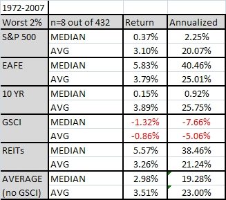 It looks like a good “trigger” for equity like asset classes is around -10%, and for bonds around -4%. That equates to about the worst 2% of all months. The worst 5% of all months is around a -7% trigger for equities and -3% for bonds.