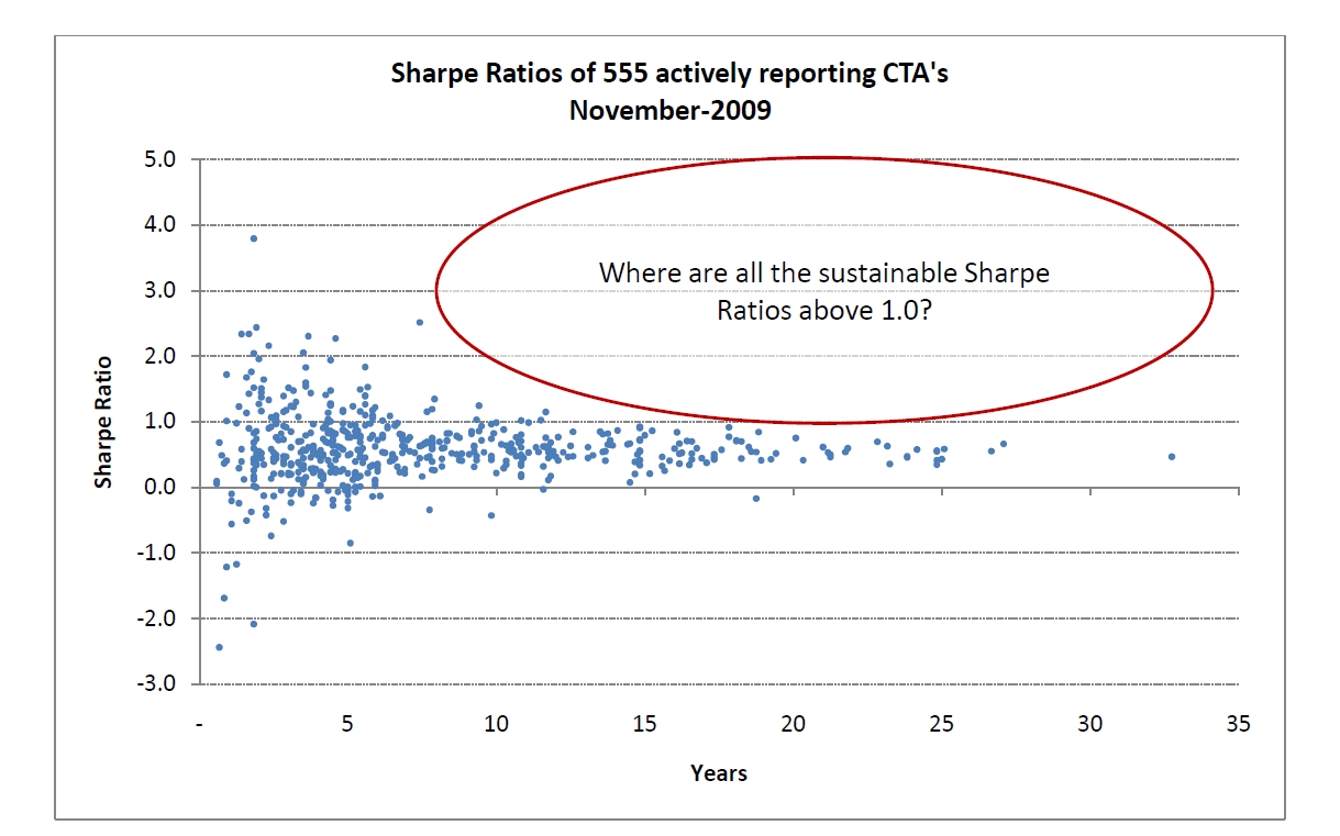 As a follow up to our earlier post “Let’s Talk About Professional Funds“, here is a great graphic from the guys at BlackStar showing the unsustainability of a Sharpe Ratio over 1 for longer than short periods of time (and this is for CTAs that still exist!!) :