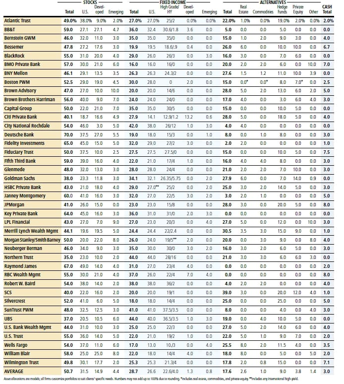 In the summary article which the advisor sent me, there’s a link to a data table showing the asset allocations of 40 of the nation’s leading wealth management groups. Below, my analyst Jonathan and I teased out all the data from the table to examine three allocations: